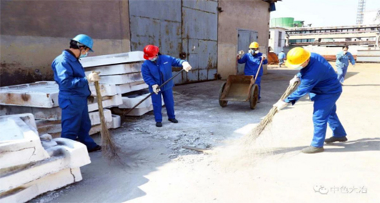 中色大冶冶煉廠團(tuán)員青年對(duì)相關(guān)區(qū)域的衛(wèi)生和含銅物料進(jìn)行清理、回收