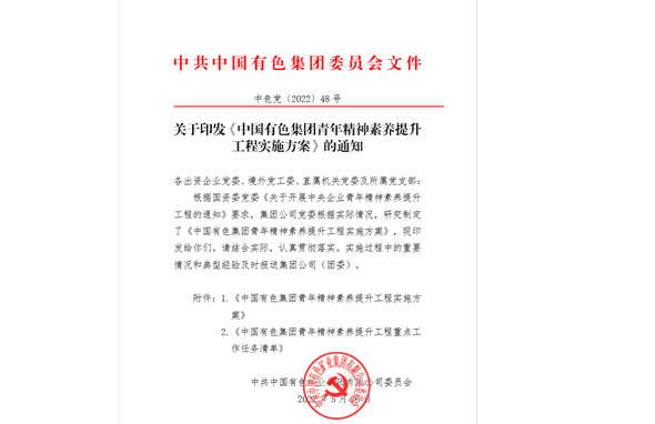 根據國資委黨委《關于開展中央企業(yè)青年精神素養(yǎng)提升工程的通知》要求,集團公司黨委根據實際情況,研究制定了《中國有色集團青年精神素養(yǎng)提升工程實施方案》。