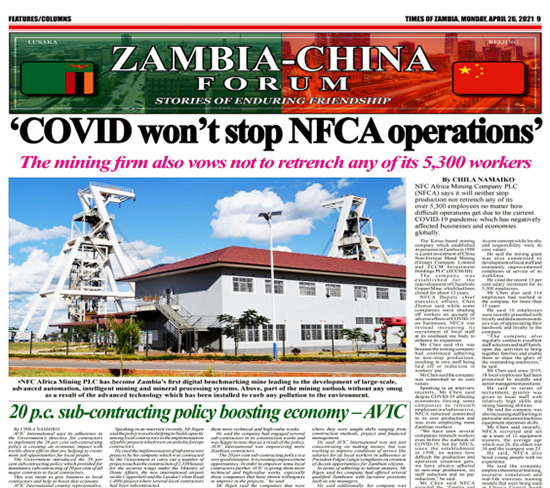 4月26日,贊比亞影響力最大的主流媒體贊比亞時(shí)報(bào)在“贊中友誼論壇”頭條位置,再次講述了中國(guó)有色集團(tuán)出資企業(yè)中色非洲礦業(yè)公司(簡(jiǎn)稱(chēng):中色非礦)故事——“疫情下,中色非礦不會(huì)裁減任何一個(gè)贊比亞員工”。同期財(cái)稅專(zhuān)版,還刊載了中色非礦自成立以來(lái)累計(jì)繳納稅收達(dá)2億美元,用行動(dòng)踐行“中贊合作、共同發(fā)展”理念,積極支持贊比亞經(jīng)濟(jì)發(fā)展的專(zhuān)題報(bào)道。