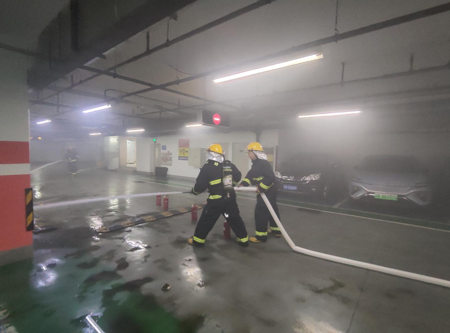 本次演練緊扣“人人講安全、個個會應(yīng)急--查找身邊安全隱患”“安全生產(chǎn)月”活動主題,模擬大廈地下車庫充電車輛起火場景。中控室值班員接警確認(rèn)后,迅速上報物業(yè)應(yīng)急指揮中心;應(yīng)急總指揮研判火情后啟動全樓疏散應(yīng)急預(yù)案并報火警,與亞運(yùn)村消防中隊和派出所聯(lián)動;現(xiàn)場撲救組攜裝備率先處置,后續(xù)與消防隊員協(xié)同滅火;疏散引導(dǎo)組指引人員沿防火通道撤離,醫(yī)療救援組及時轉(zhuǎn)移 “傷員”;設(shè)備保障組維持水電消防設(shè)備運(yùn)行,外圍警戒組配合派出所干警維護(hù)現(xiàn)場秩序。在各小組緊密配合下,用時約6分鐘完成樓內(nèi)人員撤離。后續(xù)通過持續(xù)撲救,火勢得到有效控制并最終撲滅,圓滿完成各項演練目標(biāo)。
