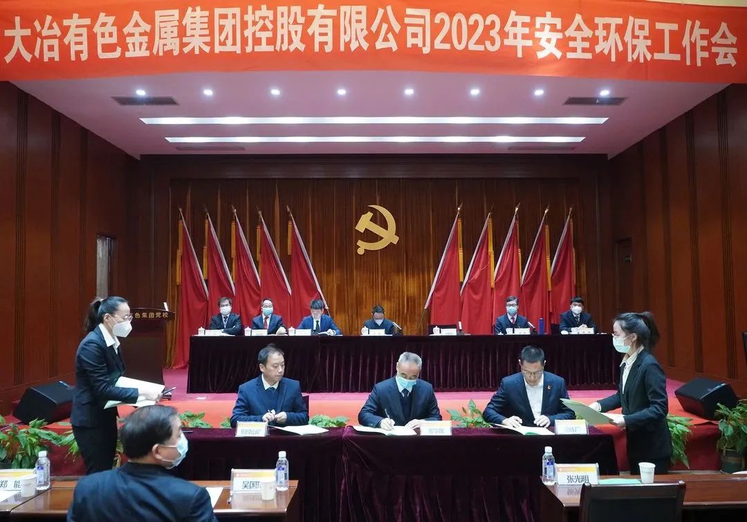 ????胡國斌與冶煉廠、銅綠山礦、豐山銅礦、弘盛銅業(yè)、銅山口礦、金格公司主要負(fù)責(zé)人現(xiàn)場簽訂了2023年度安全、環(huán)保工作目標(biāo)責(zé)任書。銅綠山礦、冶煉廠、金格公司3家單位主要負(fù)責(zé)人分別就安全環(huán)保工作作表態(tài)發(fā)言。